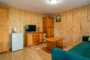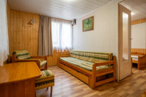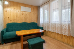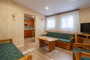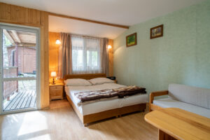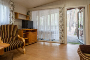 Domek 2-pokojowy wolnostojący typu „C” to idealne miejsce dla 2-4 osób podróżujących razem. Zapewnia on przestronne wnętrze, składające się z sypialni z wygodnymi łóżkami oraz salonu z dwoma sofami. Dzięki temu Goście mają mnóstwo miejsca na spanie i relaks.