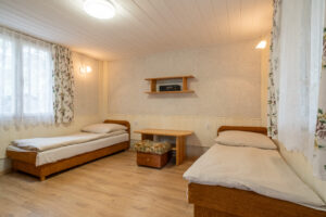 Domek 1-pokojowy, typu „bliźniak A”, to idealne miejsce dla pary lub dwóch osób podróżujących razem. Znajduje się w nim wygodny pokój o powierzchni 23 metrów kwadratowych, który oferuje przytulną przestrzeń do wypoczynku i relaksu. Wewnątrz znajdują się dwa wygodne łóżka, zapewniające komfortowy sen dla obu Gości.