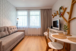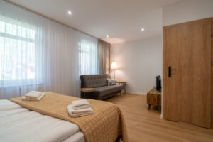 Pokój 2-osobowy typu komfort może pomieścić do 4 osób podróżujących razem. To przestronne pomieszczenie o powierzchni 24 metrów kwadratowych składa się z dwóch oddzielnych pokoi, które zapewniają prywatność i wygodę dla wszystkich Gości. W pokoju znajdują się dwa wygodne łóżka, które są idealne dla dwóch osób. Dodatkowo, w salonie znajduje się sofa, która może pełnić funkcję dodatkowego miejsca do spania dla dwóch kolejnych osób.