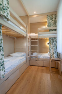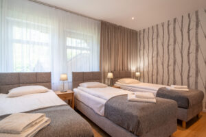 Pokój trzyosobowy typu komfort to doskonały wybór dla grupy 3-5 osób podróżujących razem. Ten przestronny pokój o powierzchni 32 metrów kwadratowych składa się z dwóch oddzielnych pokoi, zapewniających prywatność i wygodę dla wszystkich Gości. W pokoju znajdują się trzy wygodne łóżka, które zapewniają komfortowy sen i wypoczynek po dniu pełnym przygód.